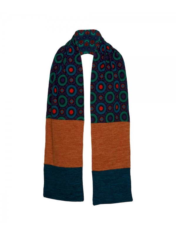 Bufanda estampada con dibujos geométricos y en dos tonos lisos turquesa y albero en un lado y estampado diferente floreado en la otra cara. Muy original, calentita. Es reversible se puede poner por ambas caras. Unisex. Marca Babadesign. Diseñado en Italia.