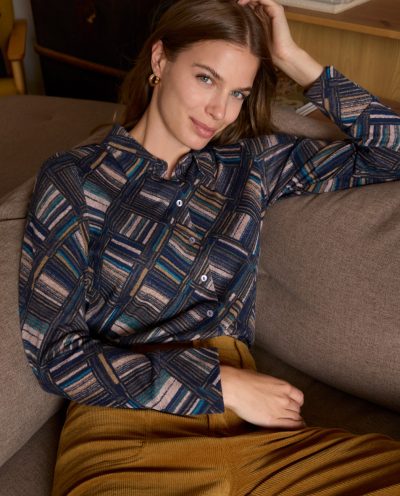 Camisa Surkana de manga larga, estampada azul y marron. Muy combinable con otros productos de nuestra colección. Moda natural y confortable para ti.