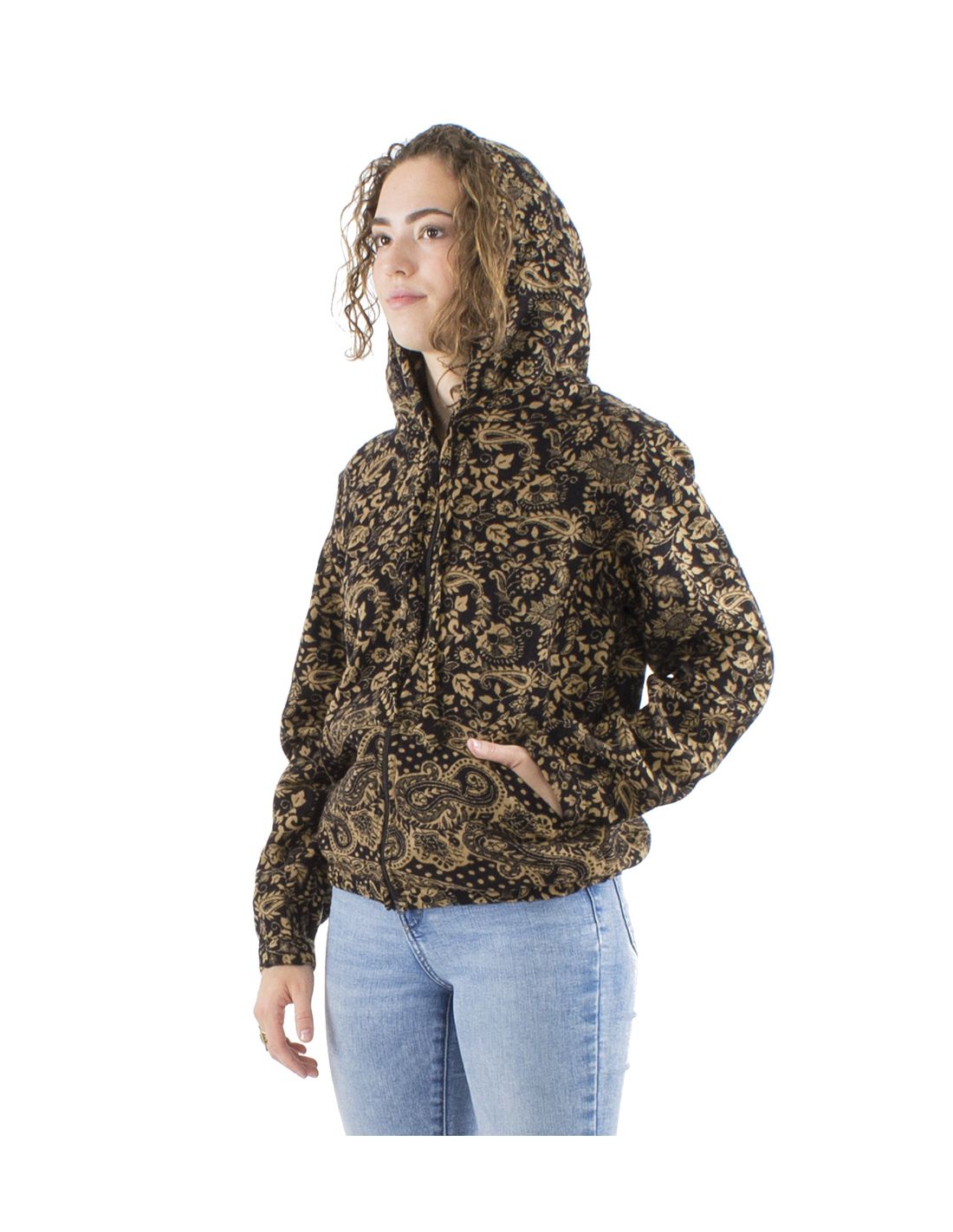 Chaqueta de estampado tapiz india, con capucha, cierre cremallera y bolsillos. Tejido suave, Muy confortable y ligero a la vez, nivel de calor medio. Muy combinable con otros productos de nuestra colección. Moda alegre y vintage para ti.
