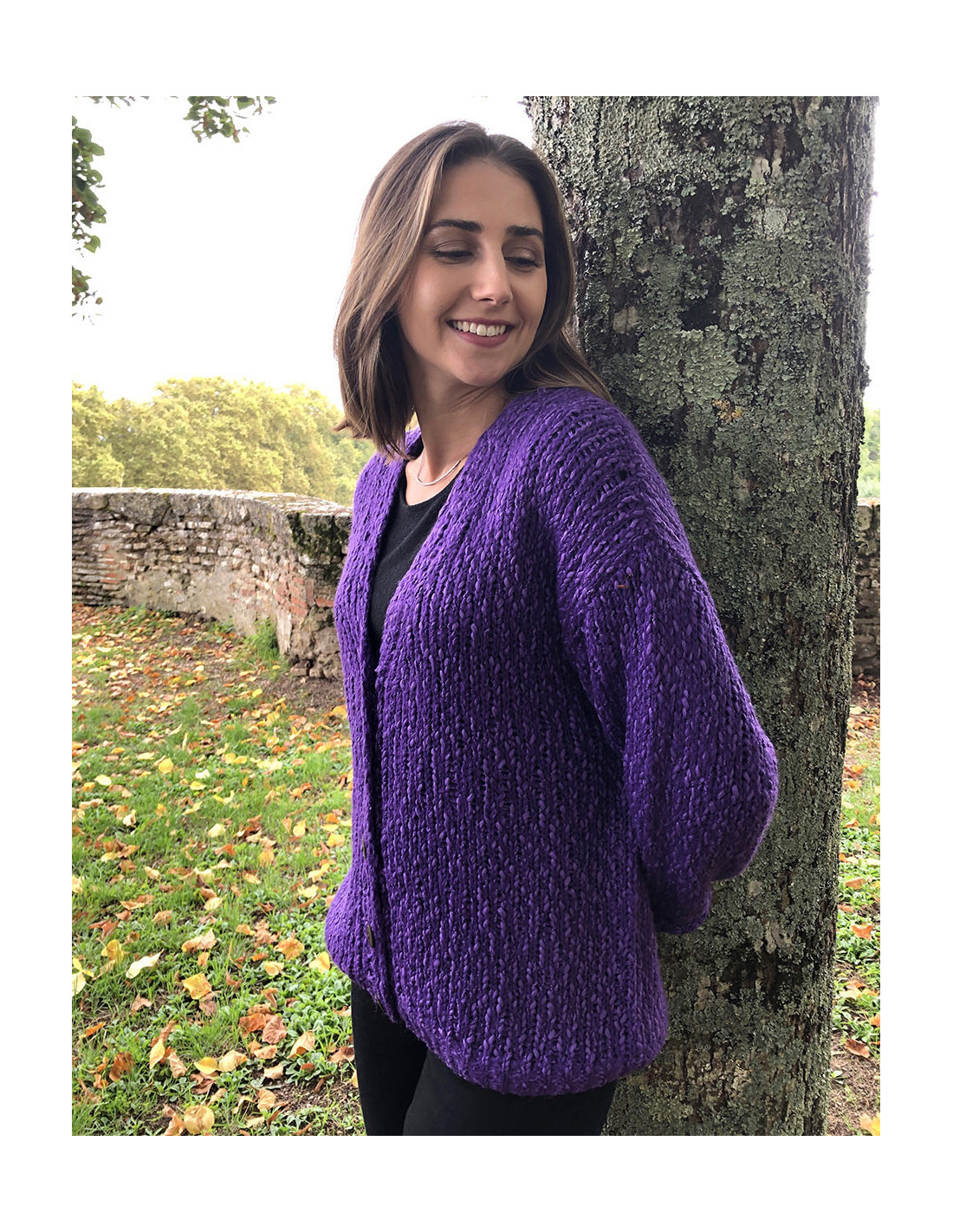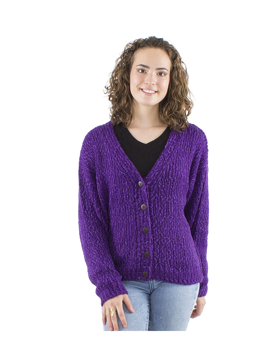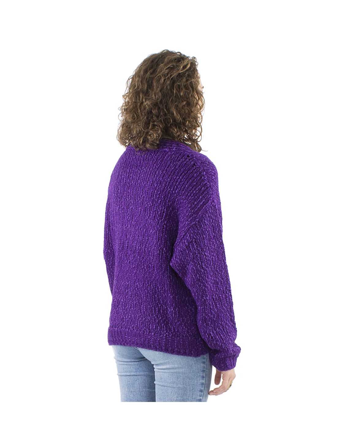 Chaqueta de punto de mangas largas en tono violeta marca Coline, botones de madera de coco, tejido calentito, muy versátil y original. De estilo boho, chic, bohemio, vintage, hippie style, moda alegre, muy combinable con otros productos de nuestra colección.