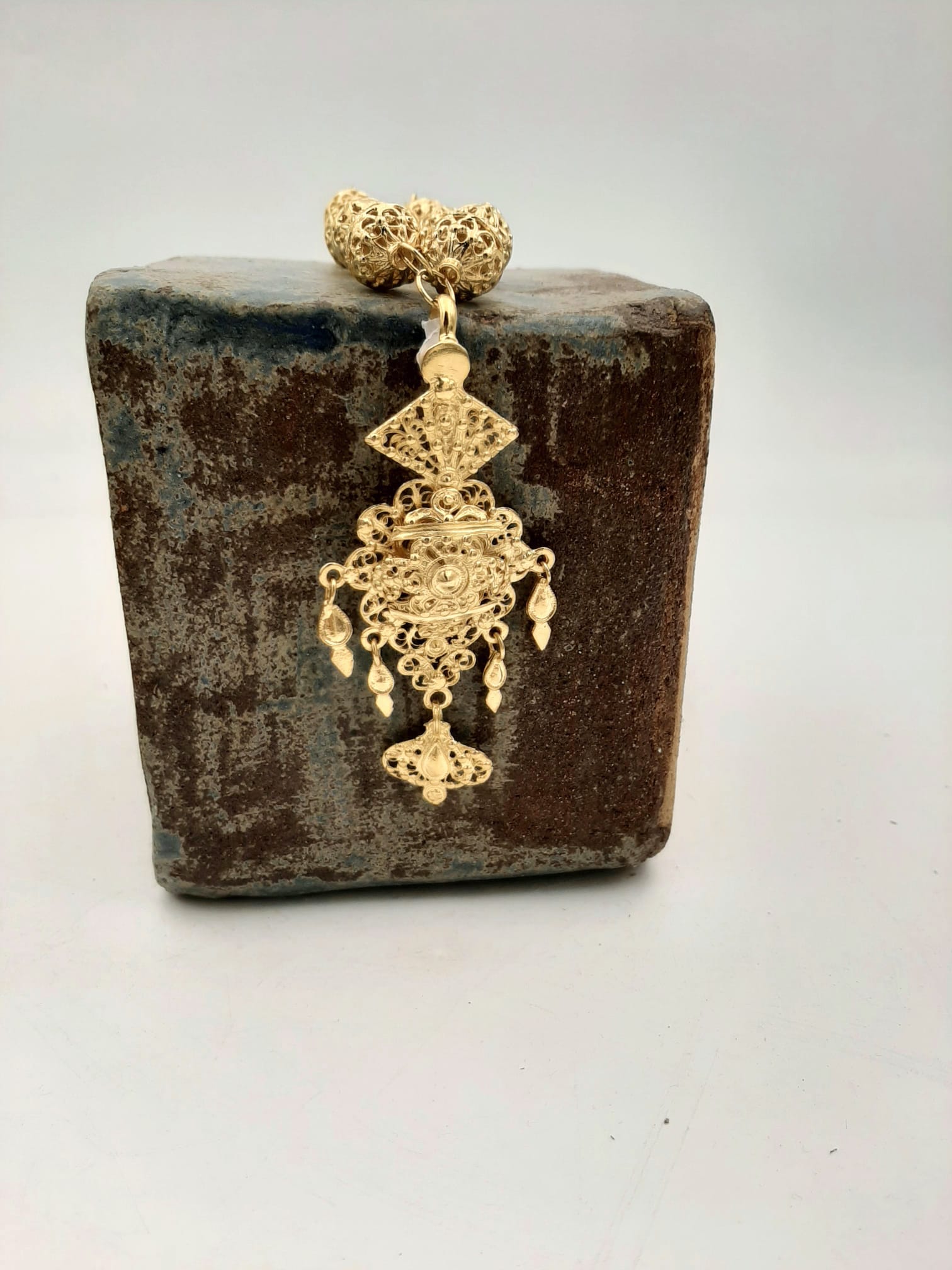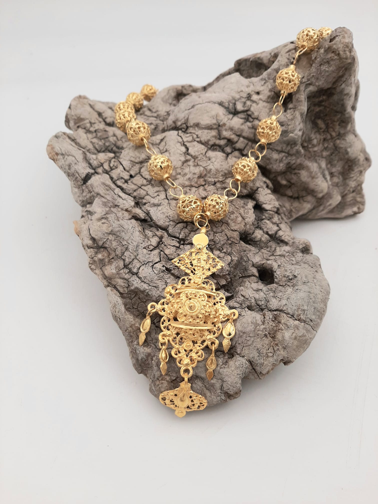 Aderezo regional compuesto de Gargantilla calada num 5, (Medidas 50,00 cm . Tamaño de la bola 1.2 cm) y Colgante de Galápago Mediano en dorado (medidas: 4 cm ancho x 9 cm largo). Utilizado en fiestas populares, regionales acompañando el traje regional típico de la zona. Es un conjunto muy elegante que se puede acompañar de los pendientes regionales. Joyas fabricadas en España 100%.