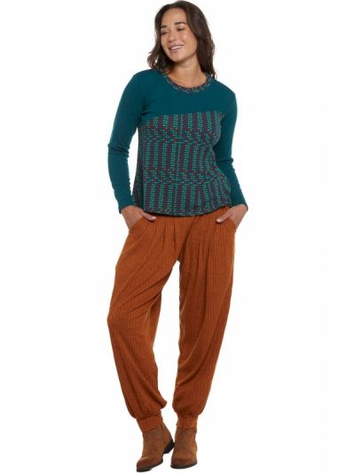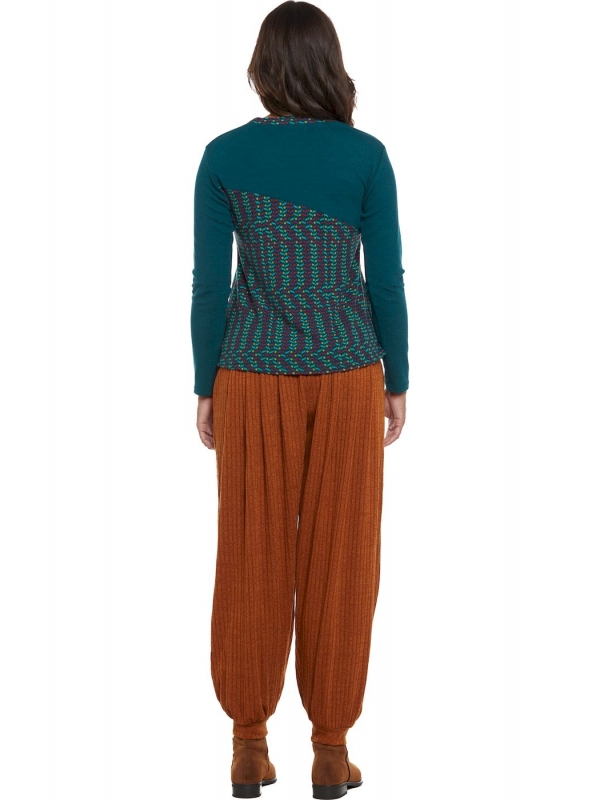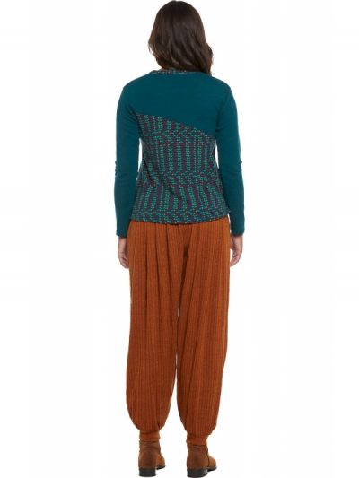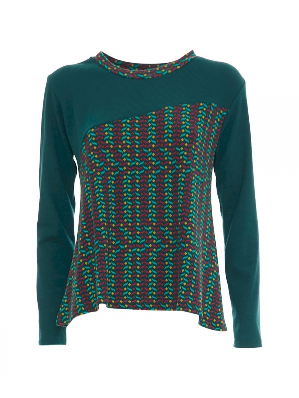 Jerseys de mangas largas en tejido lanilla con tonos turquesas y estampado multicolor, marca Babadesign, tejido calentito, muy versátil y original. De estilo boho, chic, bohemio, vintage, hippie style, moda alegre, muy combinable con otros productos de nuestra colección Baba.