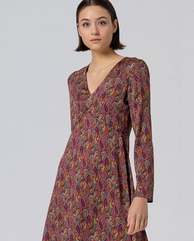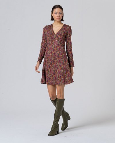Vestido largo con estampados multicolor, colores otoñales.. Con detalle de lentejuelas en cuello. Tejido muy acogedor y perfecto para el invierno.. Muy combinable con otros productos de nuestra colección. Moda alternativa para ti.